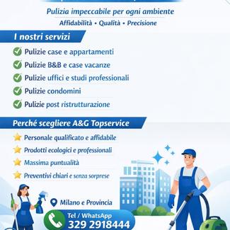 Siamo Leader nella settore di pulizie offriamo pulizie civili/industriali,condomini e case vacanze.siamo una piccola azienda da più di 4 anni settore della pulizie.