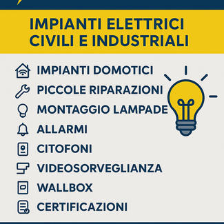 A.G. IMPIANTI ELETTRICI, nasce nel 2015, è una ditta individuale, composta dal titolare e un collaboratore specializzato, al bisogno collabora con diversi Artigiani del settore elettrico impiantistico. Fondamentalmente si occupa di impianti civili a 360°, es impianti tradizionali e di nuova tecnologia, impianti di antiintrusione e impianti di TVCC, impianti TV E Satellitare, impianti di automazione e infine impianti industriali.