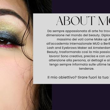 Da sempre appassionata di arte ho trovato la mia Dimensione nel mondo del beauty. Diplomata con il Massimo dei voti come make up artist all’Accademia internazionale di MUD Studio a Berlino e come Lash and eyebrows maker ad Amsterdam Exclusive Beauty, trasformando cosi la mia passione nel mio Lavoro! Sono creativa, precisa e con una grande attenzione alla persona, ai dettagli e ai colori. Mi Tengo sempre informata sulle ultime tecniche e Tendenze. Il mio obiettivo? Tirare fuori la tua bellezza!