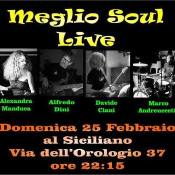 Meglio Soul è una band che opera da diversi anni in attività live, il proprio repertorio è specializzato in Soul, Funk, R’n’B e Dance , composto da alcuni dei migliori musicisti Palermitani di provata esperienza, per i vostri momenti di intrattenimento all’insegna dell’allegria Meglio Soul è la soluzione giusta.Contattaci e scopri il nostro mondo.