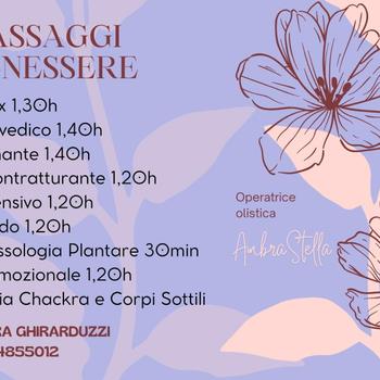 Offro qualità nel trattamento osservabile già al primo appuntamento grazie ai tanti anni maturati di esperienza e i tanti aggiornamenti svolti per dare sempre il meglio ! Offro un accoglienza gentile e disponibile nella mia casa, nel mio spazio che nutro con energia positiva , sono sempre pronta ad ascoltare le esigenze altrui fornendo più di un trattamento per risolvere cronicità ed anche consigli a 360 gradi per darti il massimo del Benessere . Sono disponibile anche il sabato e la domenica su appuntamento per le tue esigenze. Lavoro anche a domicilio. Che dire … non ti resta che provare !