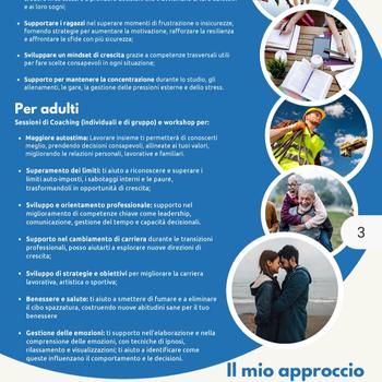 Mi occupo anche di Coaching per adolescenti e giovani sportivi, con percorsi mirati al potenziamento dell’Autostima, della Comunicazione e della Gestione delle Emozioni. Grazie alla mia specializzazione nell’orientamento al Talento, aiuto i ragazzi a riconoscere i propri punti di forza, valorizzarli e usarli con fiducia dentro e fuori dal contesto sportivo. Creo un clima sereno e stimolante in cui si sentono accolti e compresi, e collaboro attivamente con le famiglie, favorendo un percorso armonico e condiviso. Con il Coaching, i ragazzi imparano a conoscersi meglio, ad affrontare sfide con più sicurezza e a sviluppare un mindset positivo e resiliente, utile nello sport e nella vita.