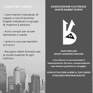 L’Associazione culturale White Rabbit Event presenta presso la sede di Via Italia 65 a Biella un luogo accogliente e amichevole, un paese delle meraviglie, dove dedicarsi all’apprendimento e alla conversazione senza dover superare test stressanti e prove dalla durata di ore che ti allontanano dal tuo obiettivo: essere in grado di parlare in inglese quando ti trovi all’estero.