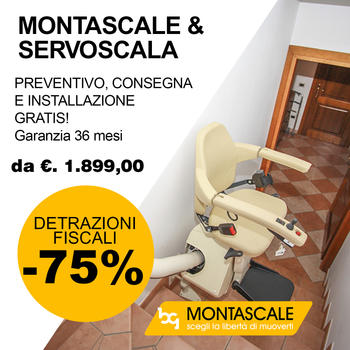 Montascale a partire da €.1.899,00. Detrazioni fiscali del -75%. Modelli in pronta consegna, si adattano ad ogni tipo di scala, senza opere murarie. Sopralluogo, Consegna e Montaggio sono gratuito. Garanzia 36 mesi.
