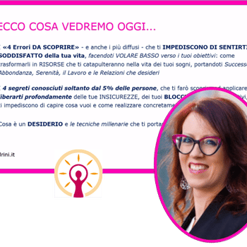 Il mio Metodo unisce la mia personale esperienza interiore di trasformazione con le mie competenze tecniche e professionale: avendo attraversato sia personalmente che come Coach tutte le tappe di un processo di cambiamento, mi consente di essere molto efficace, sostenendo e portando serenità, felicità, benessere e risultati nella vita di centinaia di persone.