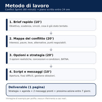 Offro un intervento rapido e concreto per sbloccare conflitti e trattative in ambito lavorativo e commerciale: in 60 minuti mettiamo ordine su obiettivi, vincoli e opzioni, e ti consegno un piano operativo pronto da usare. Mi differenzio perché non faccio “coaching generico” né teoria: lavoro con una metodologia di negoziazione e problem solving applicata ai casi reali. Alla fine ricevi una sintesi scritta con strategia, agenda della conversazione e messaggi già pronti (WhatsApp/email), così sai esattamente cosa dire e cosa fare. Non è consulenza legale e non è terapia: è facilitazione decisionale e negoziazione pratica, orientata al risultato e ai tempi rapidi.