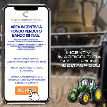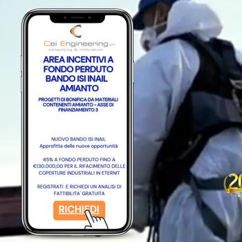 Diamo assistenza alle aziende con dipendenti per finanziamenti a fondo perduto in particolare per il Bando ISI INAIL che finanzia fino dal sessantacinque all'ottantacinque per cento a fondo perduto per miglioramento delle condizioni di sicurezza della propria azienda Assi percorribili-Rimozione Smaltimento e rifacimento coperture in amianto - Certificazioni iso sulla sicurezza uni en iso quarantacinquemilauno a fondo perduto, sostituzione e acquista macchine industriali-agricole ed edili-Cercaci su bandosemplice punto com