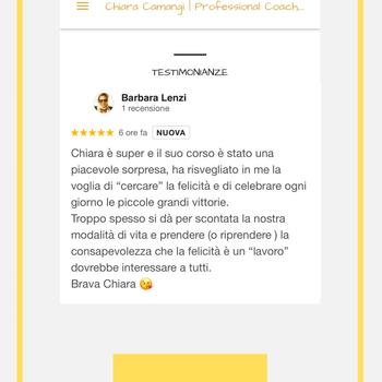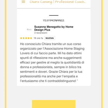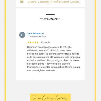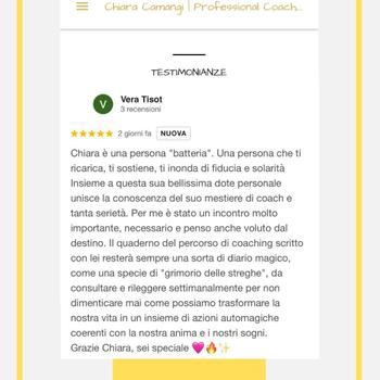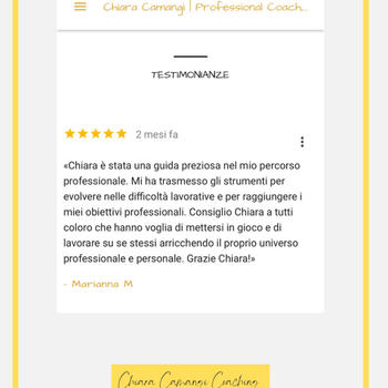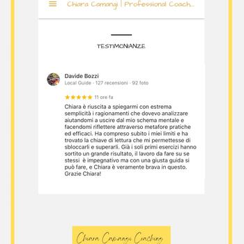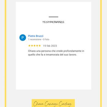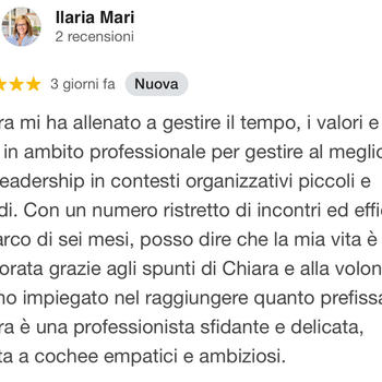 Chiara mi ha allenato a gestire il tempo, i valori e i limiti in ambito professionale per gestire al meglio la mia leadership in contesti organizzativi piccoli e grandi. Con un numero ristretto di incontri ed efficaci nell'arco di sei mesi, posso dire che la mia vita è migliorata grazie agli spunti di Chiara e alla volontà che ho impiegato nel raggiungere quanto prefissato. Chiara è una professionista sfidante e delicata, adatta a cochee empatici e ambiziosi. Ilaria M.