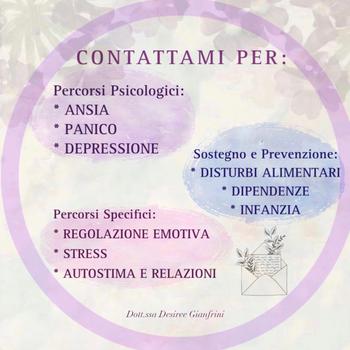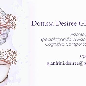 Sono la Dott.ssa Desiree Gianfrini, psicologa clinica, specializzanda in psicoterapia cognitivo comportamentale presso Studi Cognitivi di Rimini (STCC) e socio aderente della Società Italiana di Psicoterapia Cognitivo Comportamentale (CBT-Italia). Ricevo a Rimini (RN) e Online. La terapia è un'opportunità di cambiamento, volto a flessibilizzare, sostenere ed accogliere la persona, all'interno di una dimensione di sicurezza. In questo processo sono coinvolti due esperti: il professionista, esperto della tecnica e dei metodi, e la persona, esperta di sé e del suo vissuto. Grazie al nostro lavoro congiunto possiamo raggiungere la consapevolezza necessaria per superare un momento di difficoltà. Il mio obiettivo è quello di accompagnare e offrire un supporto pratico in questo percorso mirato al raggiungimento di una crescita personale e relazionale, garantendo massima disponibilità, professionalità ed empatia. A chi mi rivolgo? Adolescenti ed adulti Di cosa mi occupo? Le mie consulenze si focalizzano su diversi temi della psicologia clinica, che ho approfondito con attenzione e cura. In particolar modo, mi occupo delle seguenti tematiche su cui possiamo lavorare insieme: Percorsi Psicologici: ANSIA PANICO DEPRESSIONE Sostegno e Prevenzione DISTURBI ALIMENTARI DIPENDENZE INFANZIA Percorsi Specifici: REGOLAZIONE EMOTIVA STRESS AUTOSTIMA E RELAZIONI