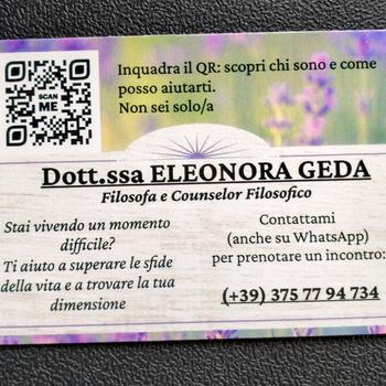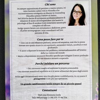 Benvenuto/a sul mio profilo! E' un piacere averti qui :) Mi presento: sono la dott.ssa Eleonora Geda. Ho una preparazione specialistica in filosofia, esercito la professione di Counselor Filosofico e sono una psicologa in formazione. Qualunque motivo ti abbia portato/a a cercare aiuto, sappi che è valido e che possiamo lavorarci insieme per sciogliere quella matassa che ora ti sembra così pesante, dolorosa o incomprensibile. Gli strumenti che la filosofia mette a disposizione sono estremamente versatili ed efficaci e hanno già aiutato svariate decine di persone a sentirsi meglio: se me ne darai la possibilità, potrò mostrarti come potranno farti riconsiderare le cose da un differente punto di vista e portarti la serenità e il benessere che desideri e meriti. Non vedo l'ora di accompagnarti in questo meraviglioso percorso, alla riscoperta di te stesso/a e dei tuo straordinario potenziale. Ad maiora! La tua Counselor, Eleonora