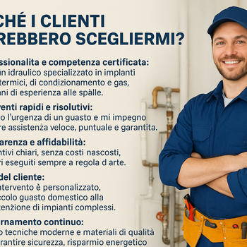 Professionalità e competenza certificata: sono un idraulico specializzato in impianti idrici, termici, di condizionamento e gas, con anni di esperienza alle spalle. Interventi rapidi e risolutivi: capisco l’urgenza di un guasto e mi impegno a offrire assistenza veloce, puntuale e garantita. Trasparenza e affidabilità: preventivi chiari, senza costi nascosti, e lavori eseguiti sempre a regola d’arte. Cura del cliente: ogni intervento è personalizzato, dal piccolo guasto domestico alla manutenzione di impianti complessi. Aggiornamento continuo: utilizzo tecniche moderne e materiali di qualità per garantire sicurezza, risparmio energetico e durata nel tempo. Se cerchi un idraulico serio, affidabile e disponibile, che metta al primo posto la tua tranquillità e il corretto funzionamento del tuo impianto, sono la scelta giusta.