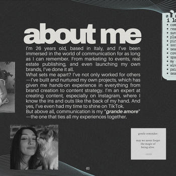 La comunicazione è il filo conduttore di tutte le mie esperienze lavorative. Nella mia carriera ho seguito il marketing e la comunicazione per diverse realtà e aziende, ma ciò che davvero mi differenzia è l’esperienza diretta nella creazione dei miei brand. Li ho costruiti da zero e, nelle fasi iniziali, mi sono occupata personalmente di ogni fase del marketing: identità visiva, strategia, produzione dei contenuti, gestione dei social e posizionamento sul mercato. Questo percorso mi ha dato una visione completa, concreta e multidisciplinare. Lavoro con metodo, creatività e una forte attenzione al dettaglio. Ogni progetto per me è unico, e lo affronto con la stessa cura e responsabilità che dedicherei a qualcosa di mio.