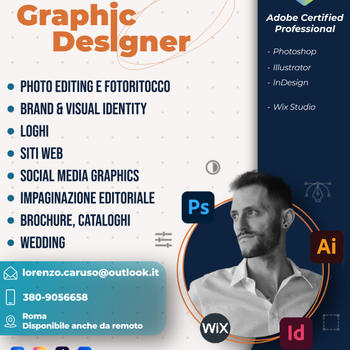 Adobe Certified Professional (ACP) in Photoshop, Illustrator e InDesign, specializzato nella creazione di grafiche moderne, pulite e di forte impatto visivo. Realizzo loghi, locandine, materiale pubblicitario, progetti editoriali e servizi di fotoritocco e fotoediting su misura, unendo creatività, precisione e attenzione ai dettagli. Lavoro con passione per trasformare le idee dei clienti in soluzioni visive efficaci e professionali.