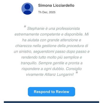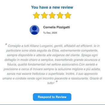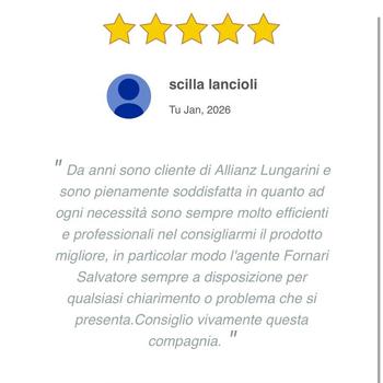 Numero Iscrizione Rui IVASS :A000129903 del 19/03/2007 Lungarini Srl PEC: [HIDDEN_BY_PRONTOPRO] L’intermediario è soggetto al controllo dell’IVASS L’Agenzia Cesena Malatesta, Assicurazioni Lungarini, nasce nel 1972 con l'Agente Oreste Lungarini e diventa Allianz nel 2013. Nel corso degli anni, i figli Daniele ed Ivan hanno seguito le orme del padre, diventando Agenti. Oggi l'Agenzia si è fortemente strutturata con uno staff di 25 persone competenti e affidate e rappresenta un importante punto di riferimento in grado di offrire risposte veloci e soluzioni personalizzate: dal risparmio alla protezione; dalla previdenza integrativa alla tutela delle imprese. Tutto ciò con un preciso obiettivo: la Soddisfazione delle esigenze dei clienti e la volontà di garantire un servizio efficiente e puntuale in ogni settore.