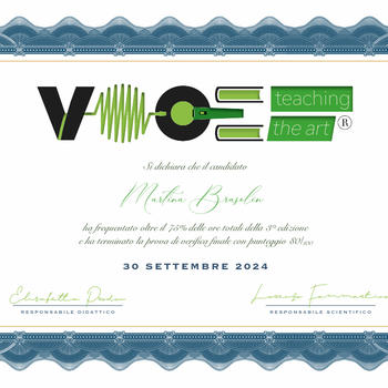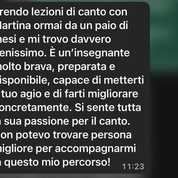 Ho una formazione in canto moderno (pop e jazz) e diploma "Voce, Teaching the Art" rilasciato dall'associazione ProVoice di Torino, diretto da Elisabetta Prodon, storica insegnante di canto e cantante jazz Torinese, e Lorenzo Fammartino, rinomato logopedista per cantanti. So pormi molto bene con vari tipi di allievi, indipendentemente dall'età o dal livello, imposto le lezioni in base alle esigenze dell'allievo.