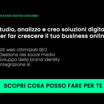 Mi chiamo Matteo Lostumbo e aiuto aziende, freelance e artigiani a crescere online con soluzioni digitali su misura: siti web moderni, SEO efficace, brand identity coerente, social media gestiti in modo strategico e integrazione dell'intelligenza artificiale per automatizzare processi e contenuti. Ogni progetto parte dall’ascolto e si sviluppa con cura, per offrire risultati concreti: più visibilità, più clienti, più tempo per concentrarti sul tuo lavoro. Opero principalmente tra Liguria e Piemonte, ma lavoro anche da remoto con clienti in tutta Italia.
