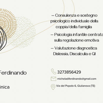 Sono la Dott.ssa Michela Di Ferdinando, psicologa clinica e psicoterapeuta sistemico-relazionale in formazione; sono, inoltre, specializzata in Analisi del comportamento applicata (ABA therapy) e mi occupo di sostegno e riabilitazione dell' adulto, del bambino e della famiglia. Il mio approccio si basa, in primo luogo, sul processo di ridefinizione del sintomo che la persona mi porta, attuando il passaggio da indicatore di malattia a portatore di significato profondo. In secondo luogo, sull' esplorazione di tale significato, attraverso un processo di reciproco scambio che aiuti la persona a trovare dentro di sé le risorse utili a funzionare meglio e a comprendere i ruoli che riveste nel proprio contesto di vita e nelle relazioni più significative. La riduzione del sintomo e il miglioramento della qualità di vita ne saranno una conseguenza.