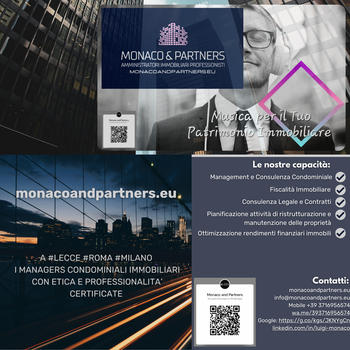 MONACO E PARTNERS - Amministratori Immobiliari Professionisti è, nel Settore delle Gestioni Immobiliari, sinonimo di Competenze Specialistiche e Certificate da Organismi Internazionali, Livello di Servizio alto di gamma e sartoriale, approccio Etico e garanzia di concreta Professionalità verso tutti i Proprietari di Immobili, nei contesti Condominiali come nell'ambito della Proprietà esclusiva. Le nostre esperienze e capacità si traducono in una ricetta vincente e tutelante, applicata con grande entusiasmo e perseveranza in Lombardia, Lazio e Puglia. I nostri Clienti sono consapevoli di avere al loro fianco non un semplice Amministratore, ma un Manager Fiduciario dotato di Qualità Tecniche ricercate e di un grande bagaglio di Valori Umani, indispensabili presupposti di un Livello Customer Experience e Customer Satisfaction senza eguali. Qualità ed Etica, in tutte le loro declinazioni, sono per Noi il valore quotidiano e strategico garantito ed il segno distintivo che ci permette di porre Cliente al Centro, tutelandolo costantemente. Se vuoi approfondire chi Siamo, cosa facciamo, come potremmo suggerirti soluzioni per ottimizzare il rendimento del tuo patrimonio Immobiliare, accedere semplicemente ai nostri Consigli a Difesa e Tutela della Proprietà, contattaci grazie alle diverse modalità disponibili: MONACO & PARTNERS - Amministratori Immobiliari Professionisti Registro Nazionale Amministratori Confedilizia