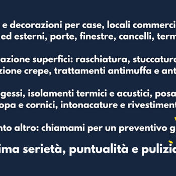 Mori Tinteggi… l’arte del colore sulle tua mura ! trasformiamo pareti e ambienti con professionalità, precisione e passione. La nostra missione è semplice: dare nuova vita agli spazi, rendendoli più belli, accoglienti e su misura per chi li vive. Cosa offriamo: -Tinteggiature interne ed esterne di qualità -Vernici di qualità e certificate -Decorazioni, effetti speciali e finiture particolari • Consulenza sul colore e scelta delle migliori soluzioni Con esperienza artigianale, materiali di prima scelta e attenzione ai dettagli, garantiamo lavori puliti, puntuali e duraturi. Che sia un appartamento, una casa singola, un condominio intero, un capannone, una azienda, un ufficio o un locale commerciale, con Mori Tinteggi le tue pareti non saranno mai banali. Contattaci oggi per un preventivo gratuito: trasformiamo insieme i tuoi spazi!