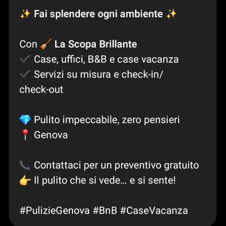 IMPRESA PULIZIE GENERALI LA SCOPA BRILLANTE A GENOVA.ESEGUE PULIZIE PRESO UFFICi,B&B, CONDÒMINI,APARTAMENTI ,E IMPIANTI SPORTIVI.PER INFORMAZIONI E PREVENTIVI INVIARE EMAIL: [HIDDEN_BY_PRONTOPRO]