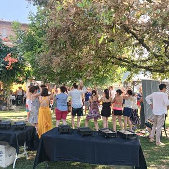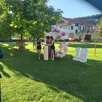Location con ampio parco dotato di piscina con solarium, zona volley su prato, ping-pong, calcio balilla, 2 barbecue, zona ombreggiata con tavoli e sedie, parco con gazebi, aiuole con fiori e alberi. Locale coperto di 300 mtq. con capienza di ca 150 persone