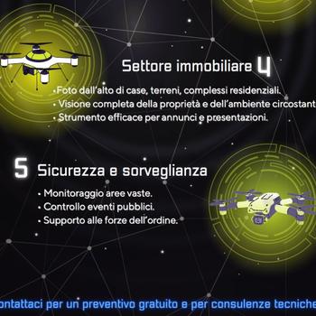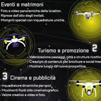 Effettuo video e foto aeree con droni, per immortalare eventi, paesaggi ecc, per dare vita ai tuoi momenti e progetti con prospettive uniche! Disponibile per eventi e matrimoni, turismo e promozione, cinema e pubblicità, settore immobiliare, sicurezza e sorveglianza.