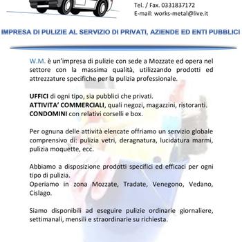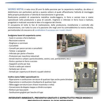 Realizziamo prodotti di carpenteria metallica medio-leggera, in ferro e acciaio inox e siamo specializzati nella produzione e posa di cancelli, ringhiere e inferiate in ferro liscio e battuto, progettati e realizzati secondo le idee e le esigenze del cliente. Ci occupiamo di tutte le fasi di realizzazione, dalla produzione, installazione e controllo alla manutenzione, con tutta la cura e la passione che negli anni ha contraddistinto la nostra attività, permettendoci di crescere e di condividere il successo con i nostri clienti. Works metal è inoltre un’impresa di pulizie con sede a Mozzate ed opera nel settore con la massima qualità, utilizzando prodotti ed attrezzature specifiche per la pulizia professionale.